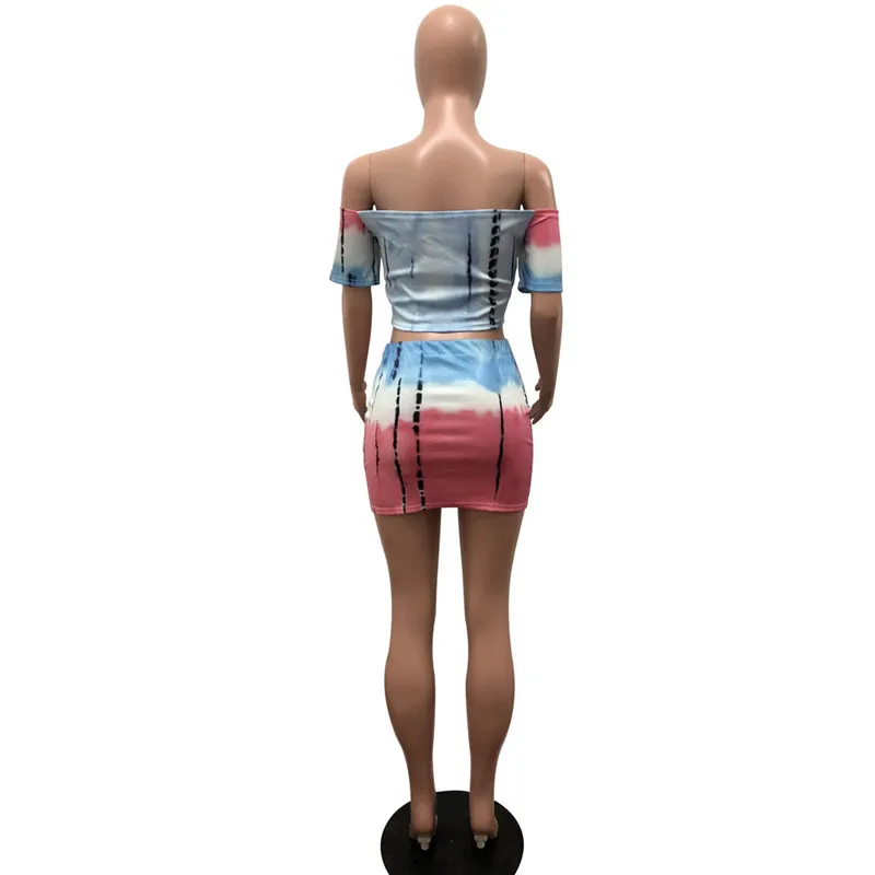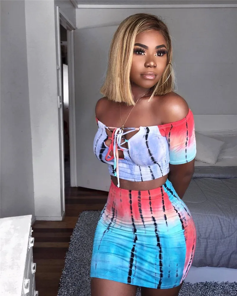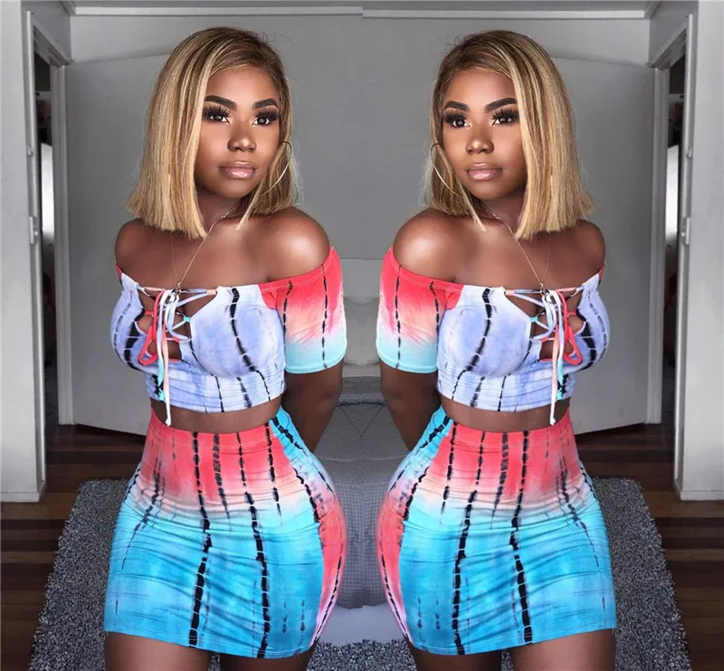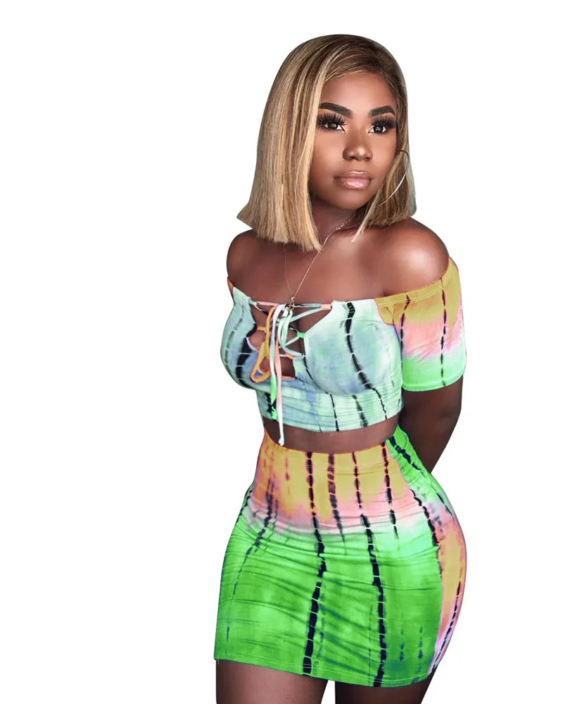 Women Two Piece Set Lace up Crop Top and Skirt Set Tie Dye Pattern Printed T Shirts Casual Tracksuit 2 Piece Outfits