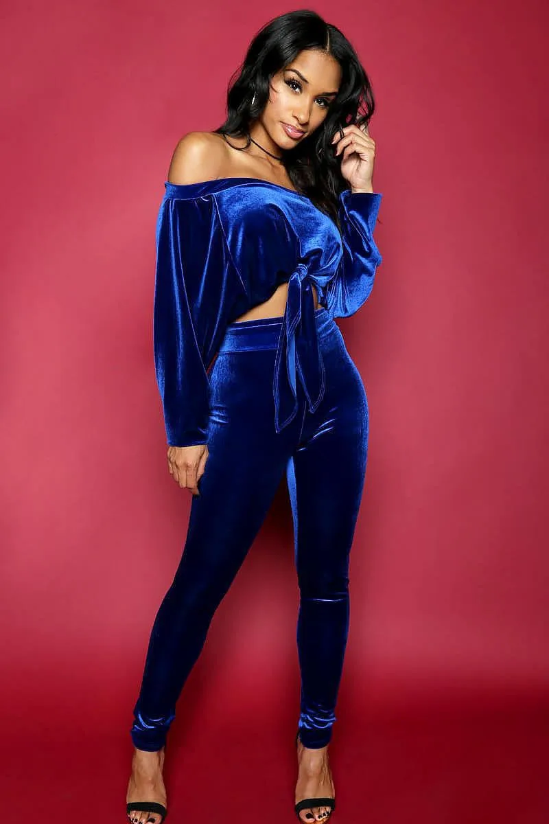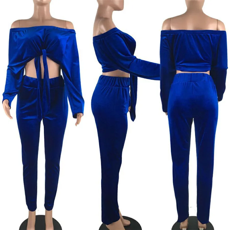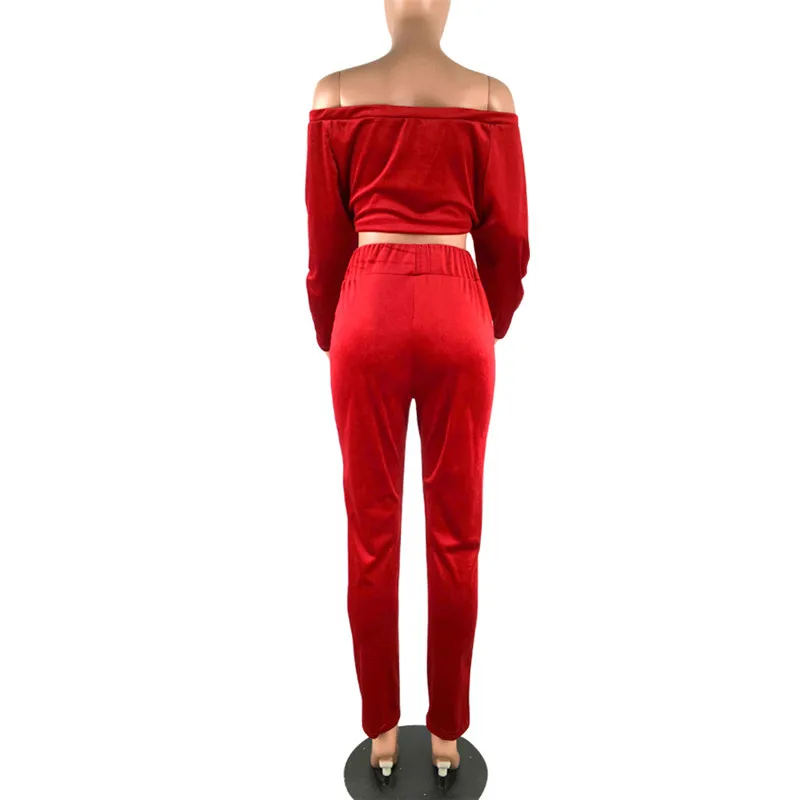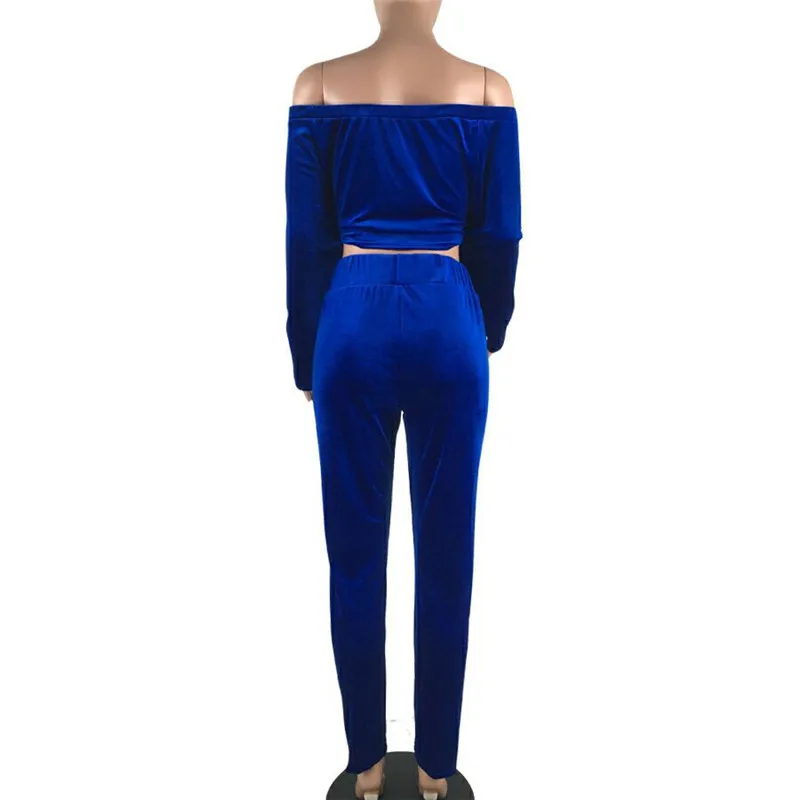 Women Velvet Two Piece Sets Female Winter Tracksuit Off Shoulder Crop Top + Pants Ladies Long Sleeve Outfit Femme Sporting Suits