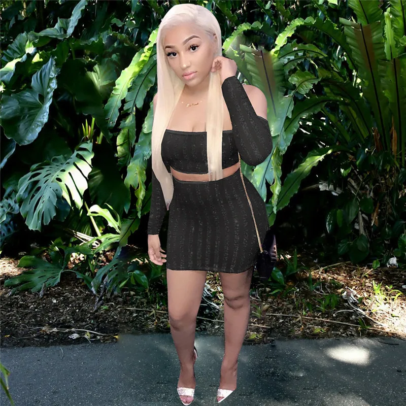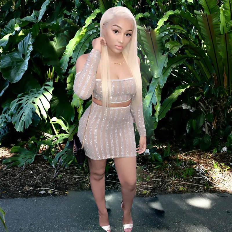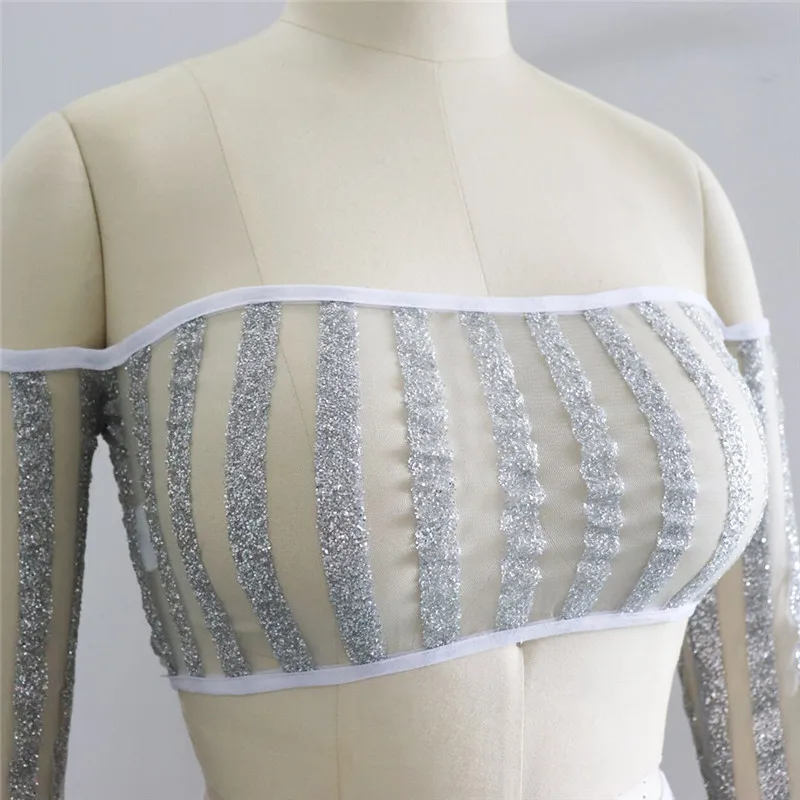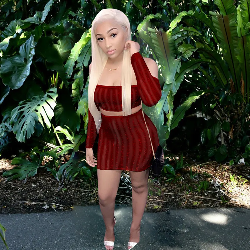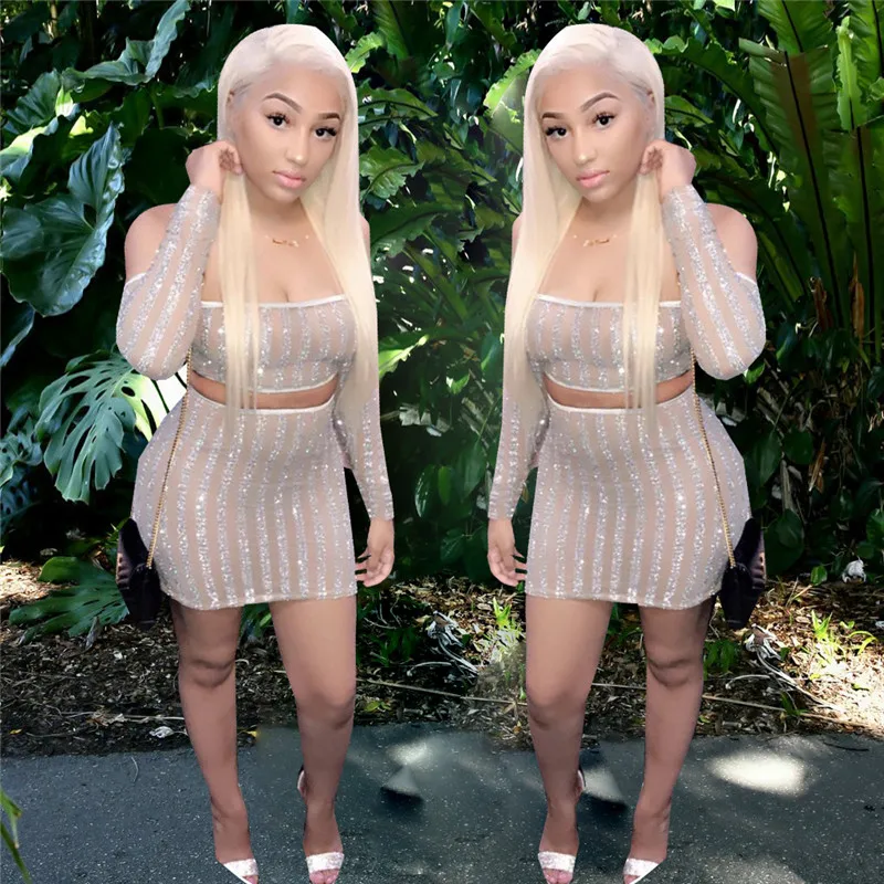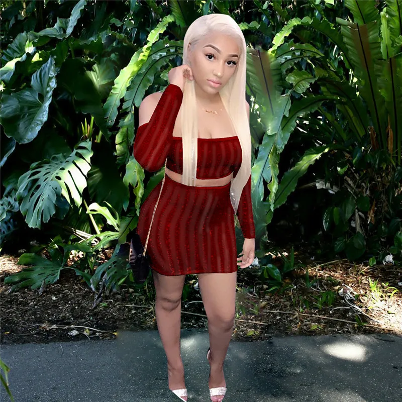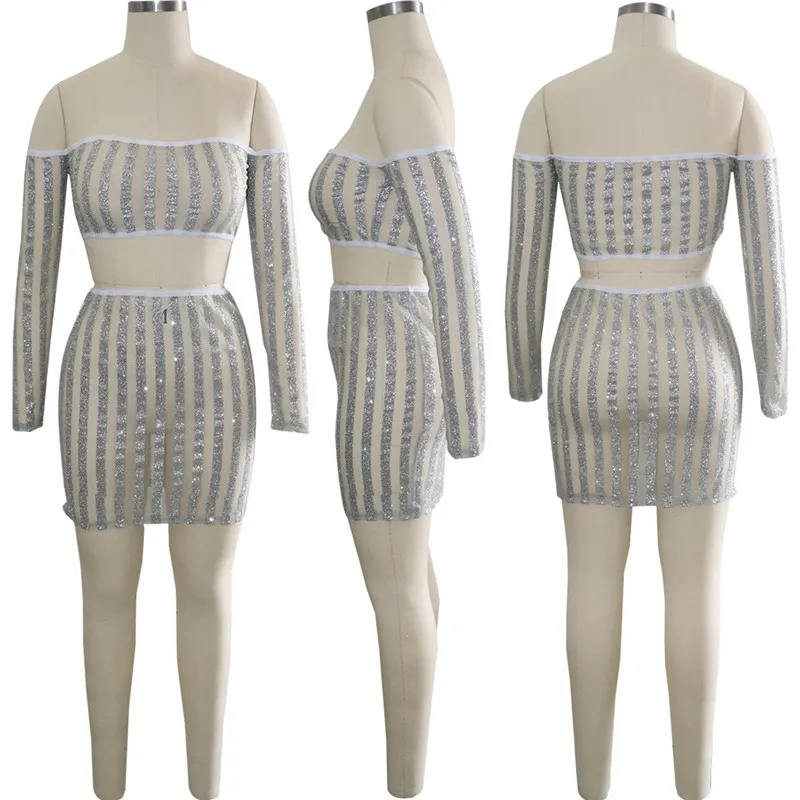 Women's Suit Striped Glitter Two Piece Skirt Set Autumn Sexy Strapless Long Sleeve Mesh Sheer Crop Top and Mini Skirt Celebrity