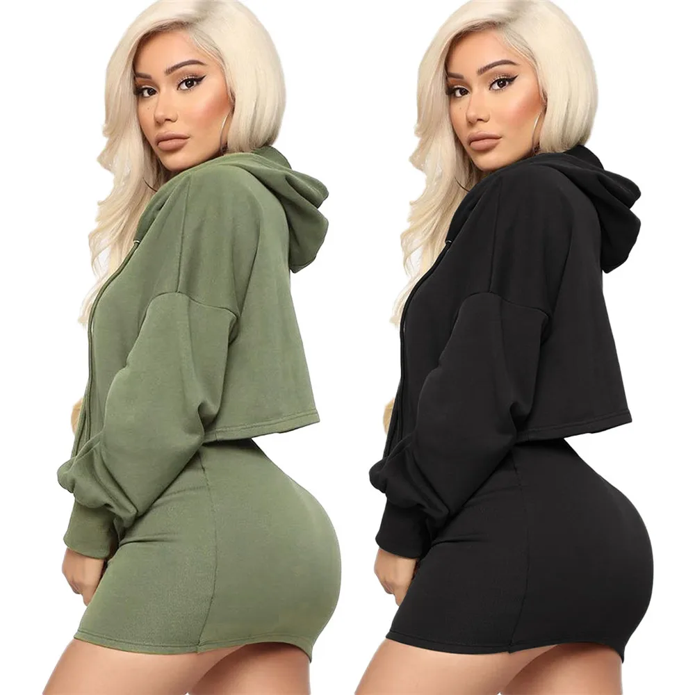 Spring Autumn Two Piece Skirt Set Women Hooded Long Sleeve Sweatshirt Crop Top and Mini Skirt Casual Club 2 Piece Outfits