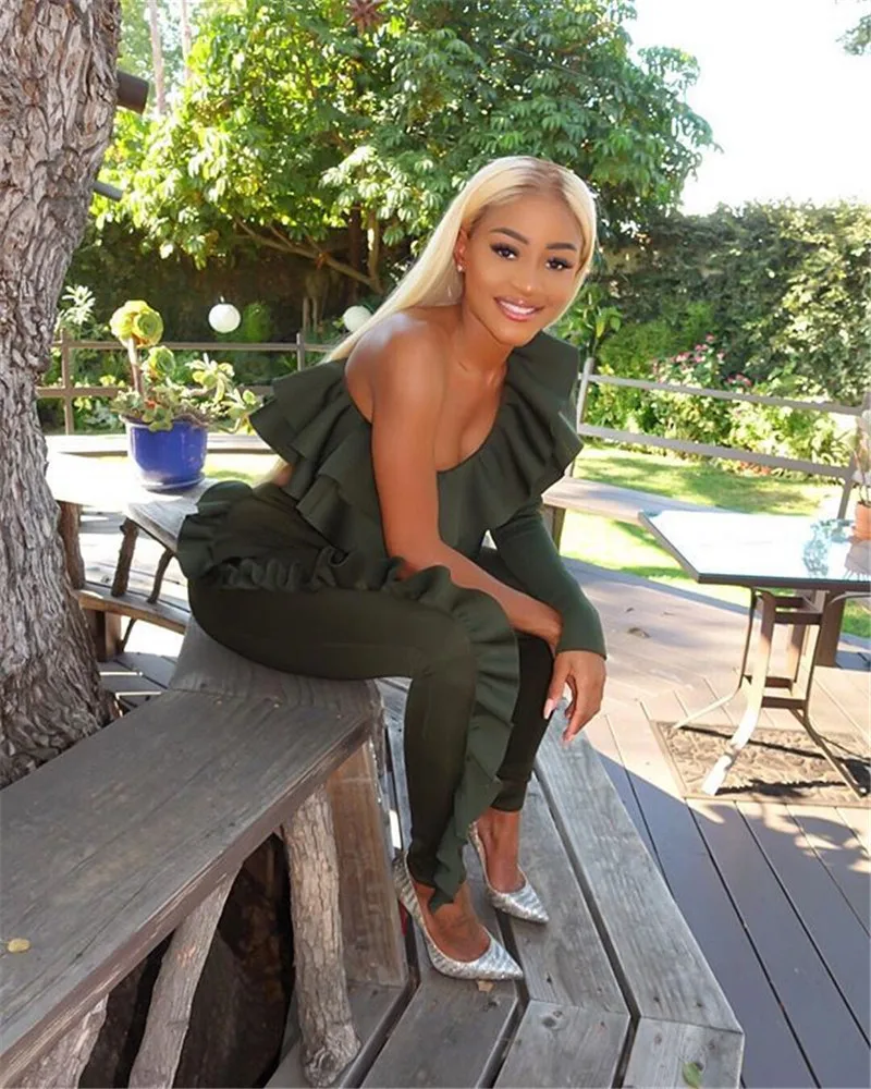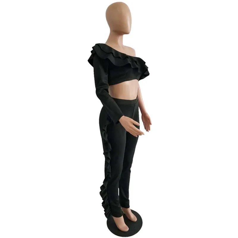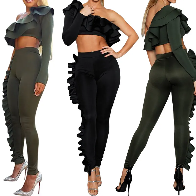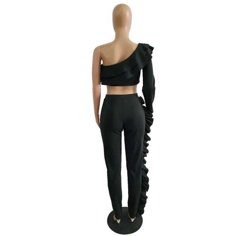Two Piece Sets One Shoulder Flounce Crop Sweatshirt & Sweatpants for Women Ruffles Long Sleeve Tracksuit Pantsuit