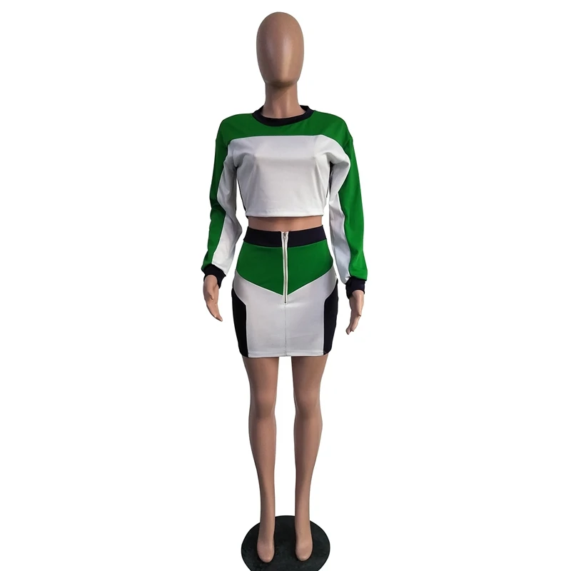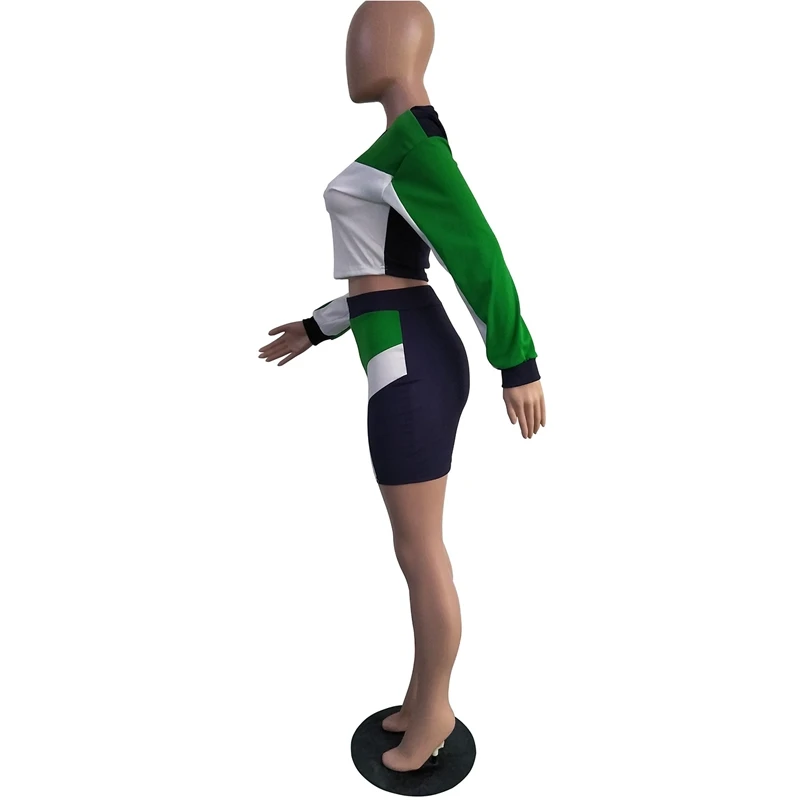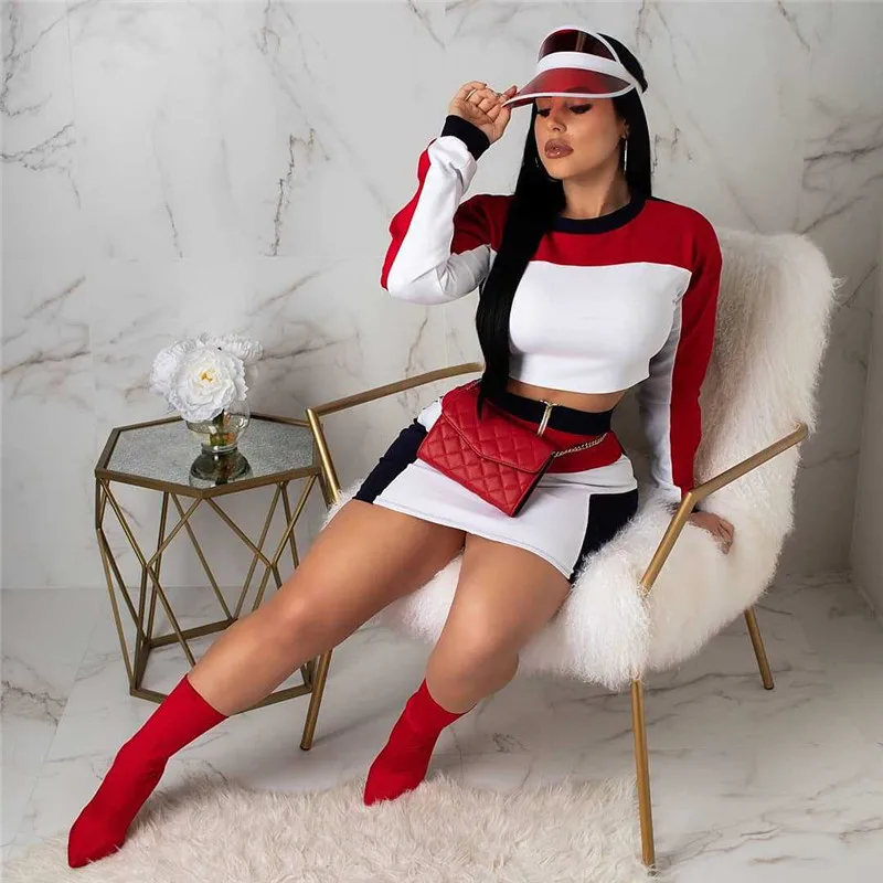 Casual 2 Piece Set Tracksuit Patchwork Crop Top and Zipper Bodycon Mini Skirt Set Party Club Sexy Two Piece Outfits