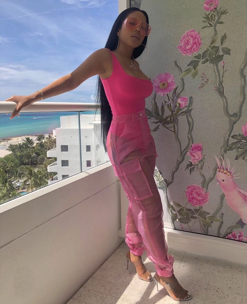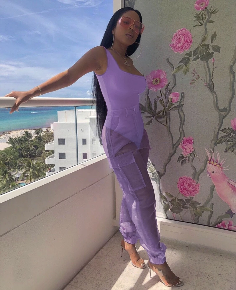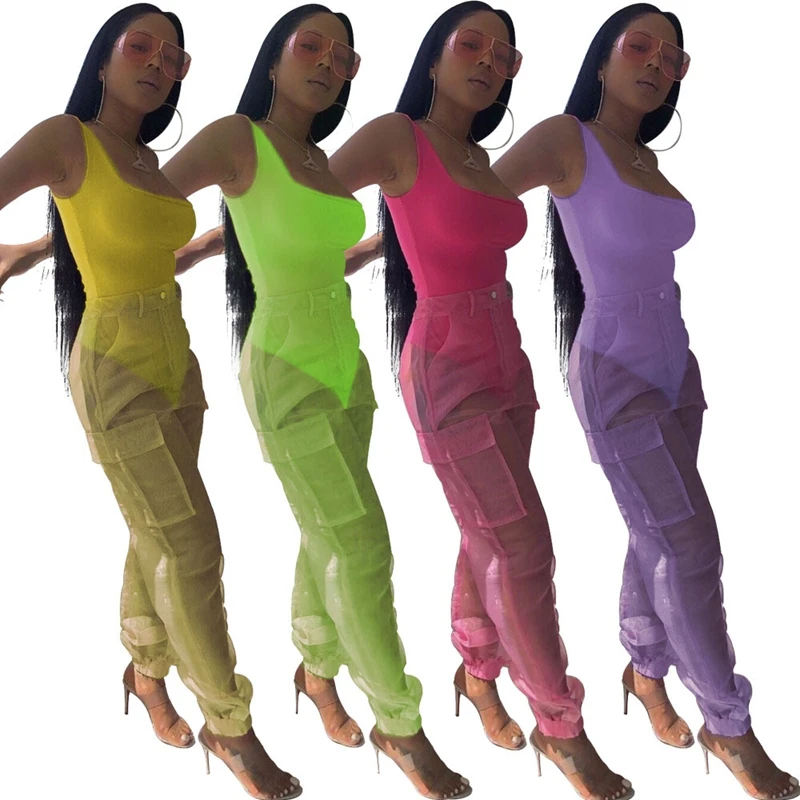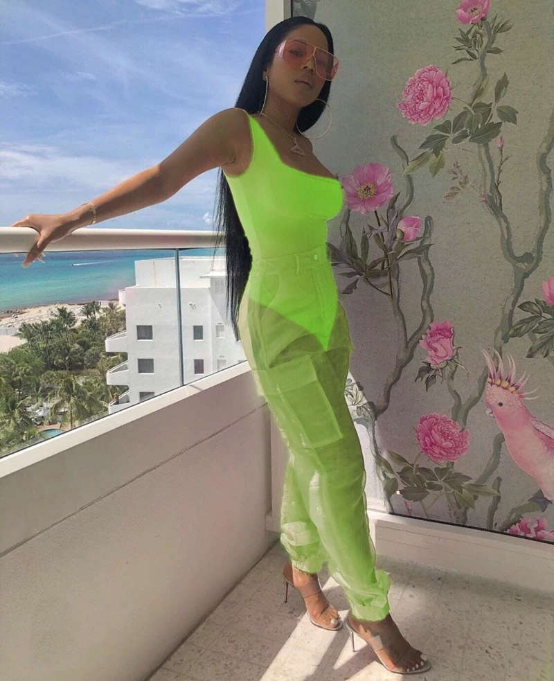 Neon Two Piece Set Top and Pants Tracksuit Women Festival Clothing Bodysuit Cargo Pants Mesh Summer 2 Piece Sexy Club Outfits