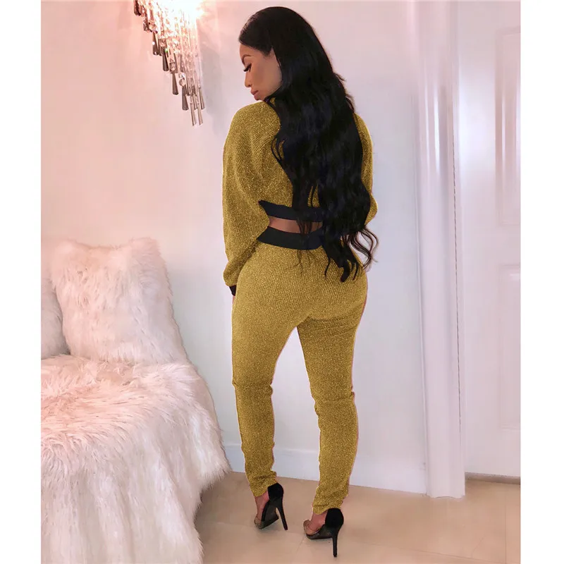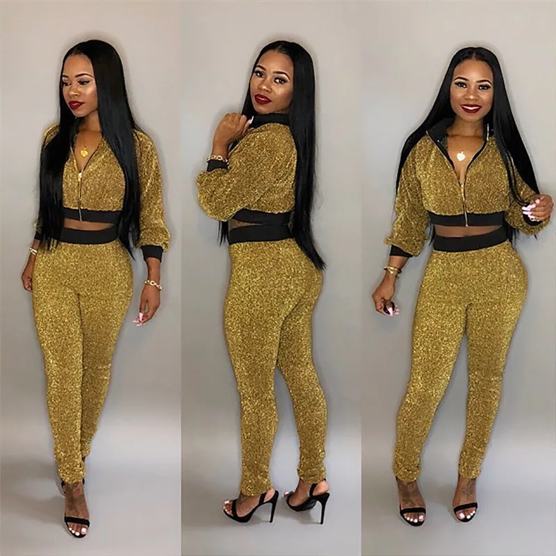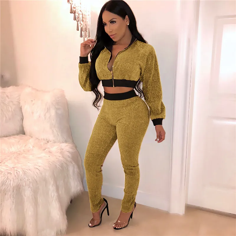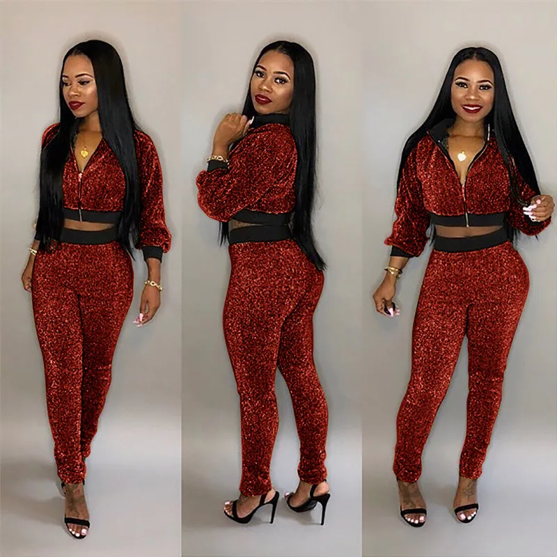 Plus Size Glitter 2 Piece Outfits for Women's Suit Sequined Streetwear Bomber Jacket Tops and Pants Set Sparkly Casual Tracksuit