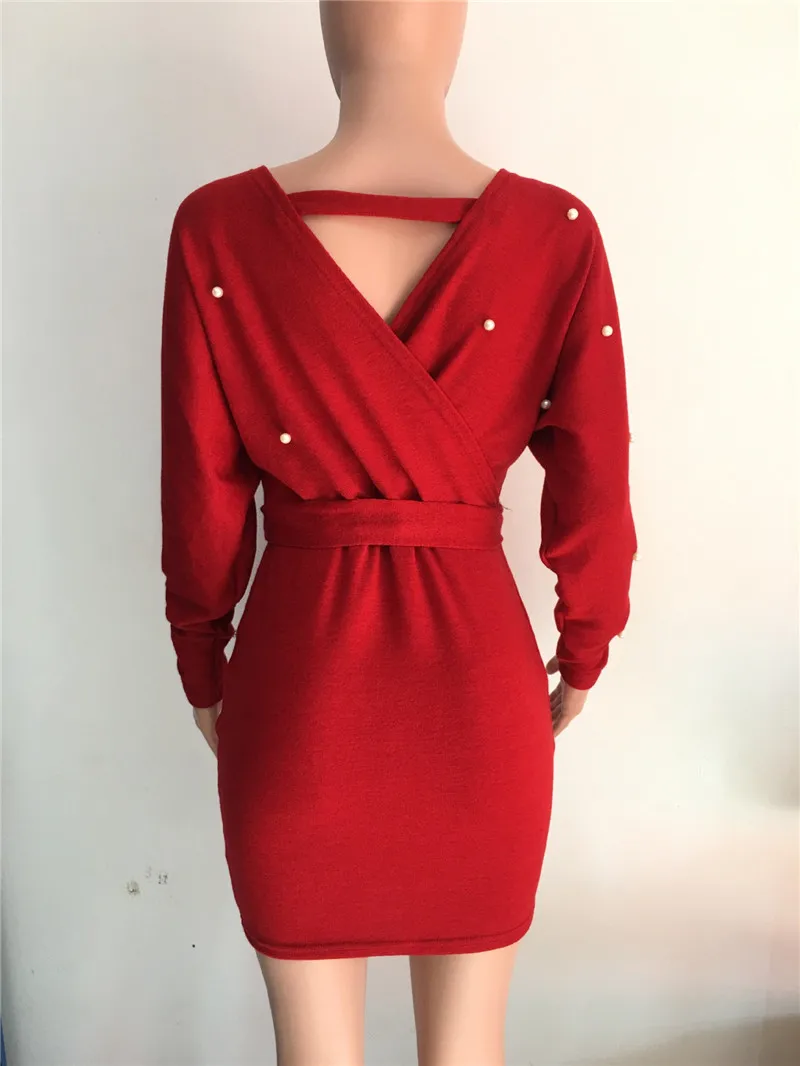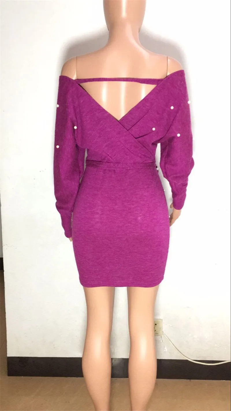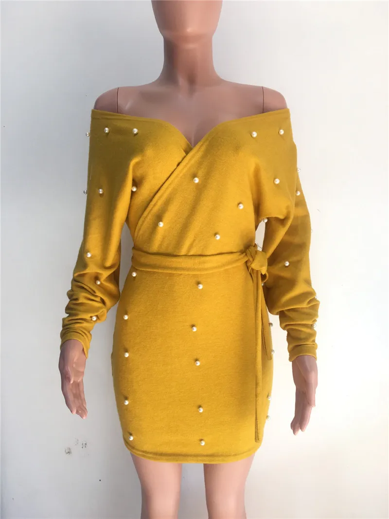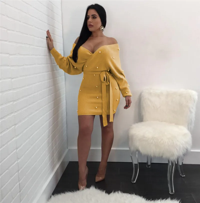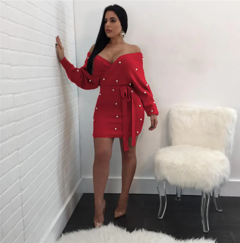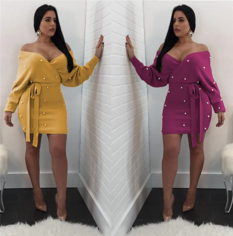 Sexy Off Shoulder Knitting Sweater Dress Women Elegant Pearls Sashes Short Wrap Dress Casual Long Sleeve Autumn Winter Dresses