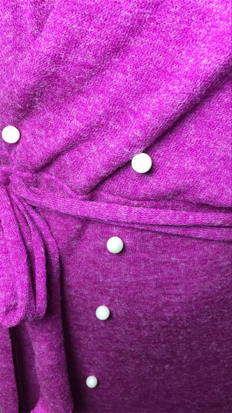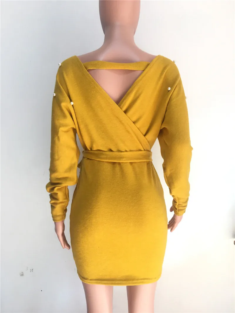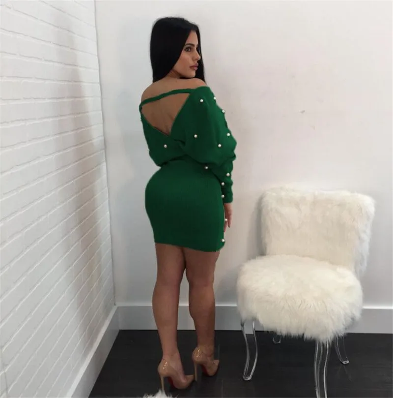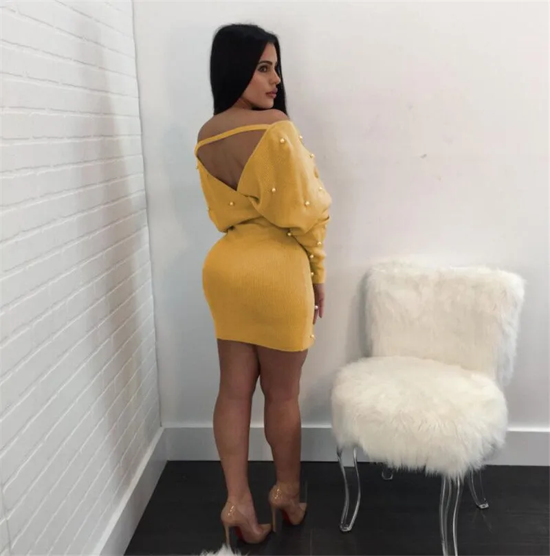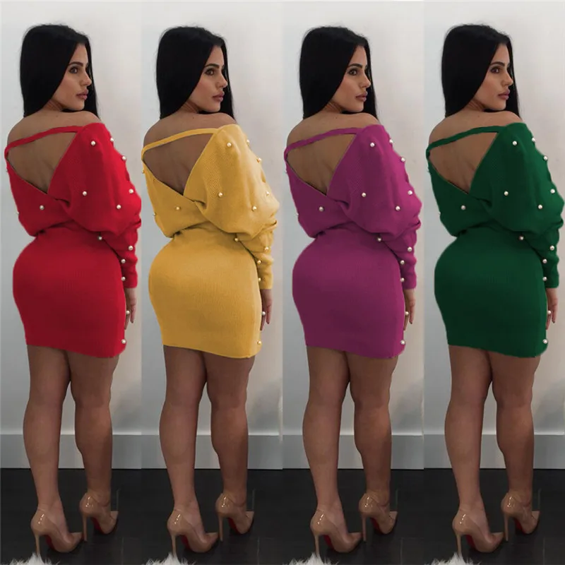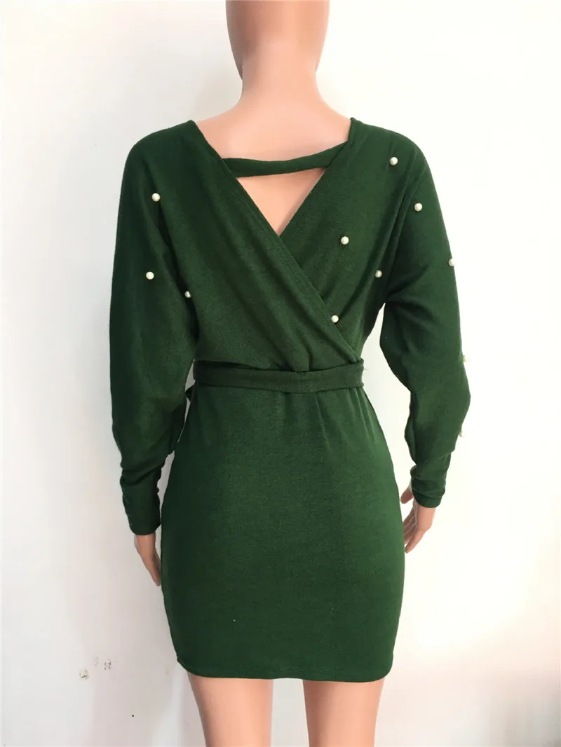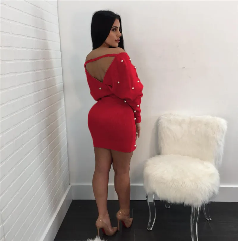 Sexy Off Shoulder Knitting Sweater Dress Women Elegant Pearls Sashes Short Wrap Dress Casual Long Sleeve Autumn Winter Dresses