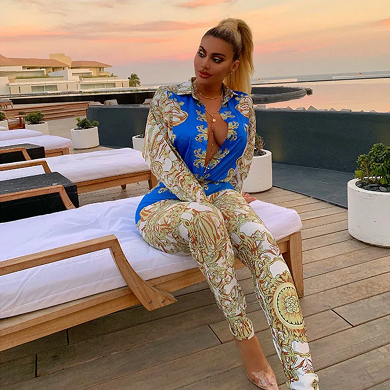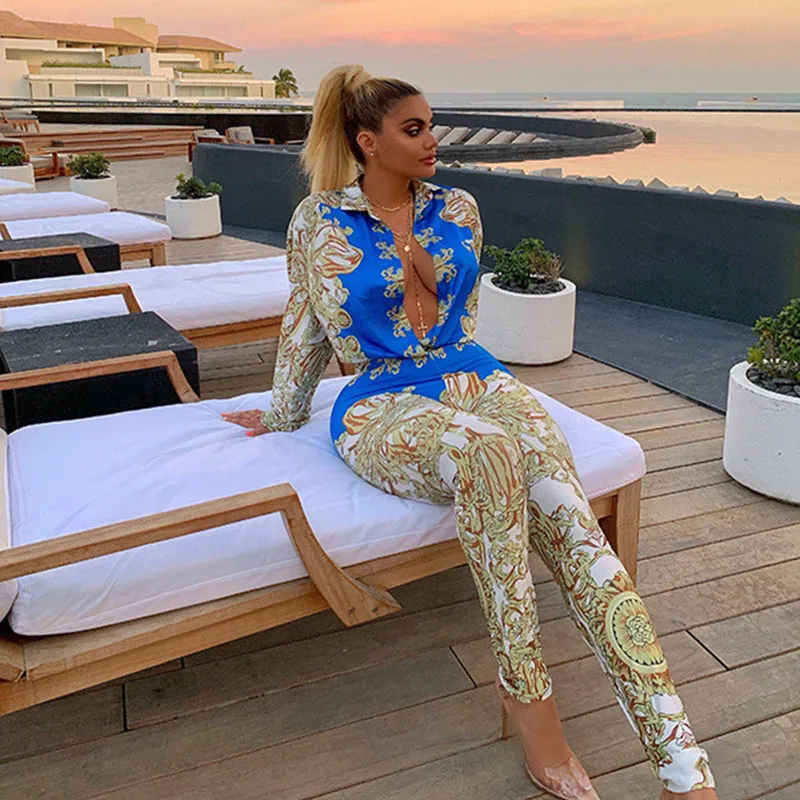 Sexy Two Piece Sets Tracksuit Women Vintage Print Long Sleeve Shirt Tops and Pencil Pants Clubwear 2 Pcs Outfits Sweat Suits