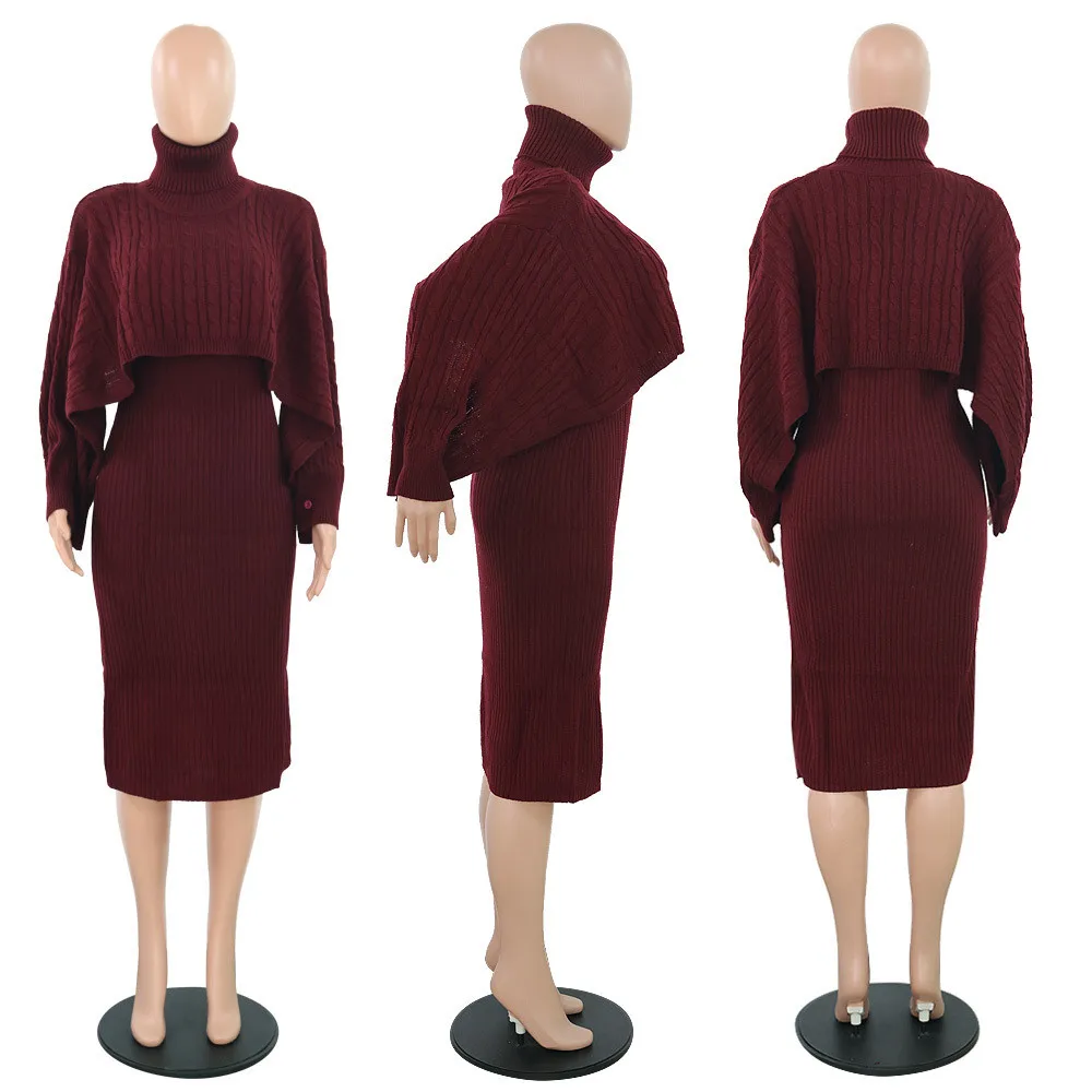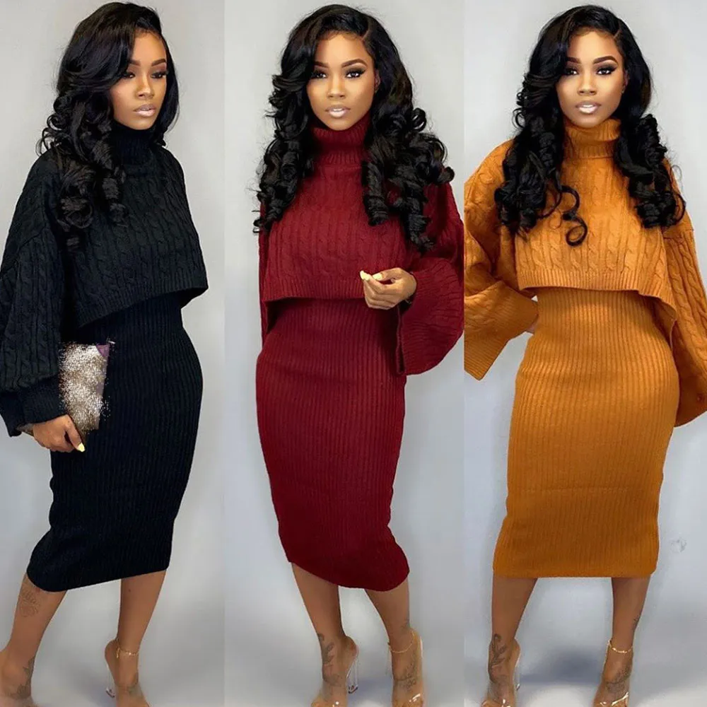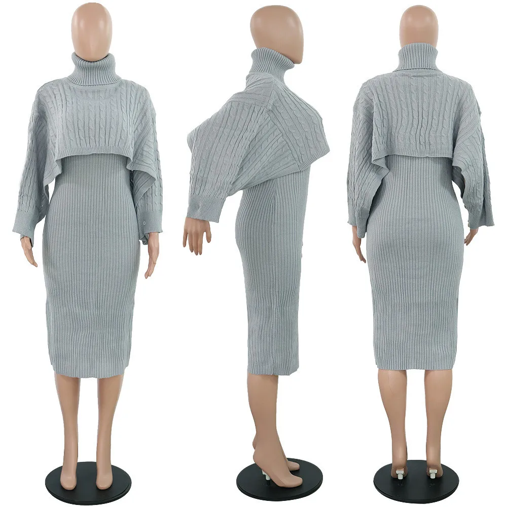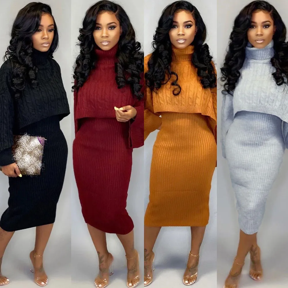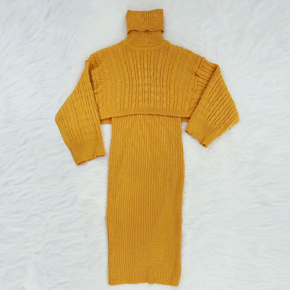 Turtleneck Long Sleeve Sweater Dress Women Autumn Winter Dress Loose Tunic Top Knit Rib Warm Two Piece Dresses Party Midi Dress