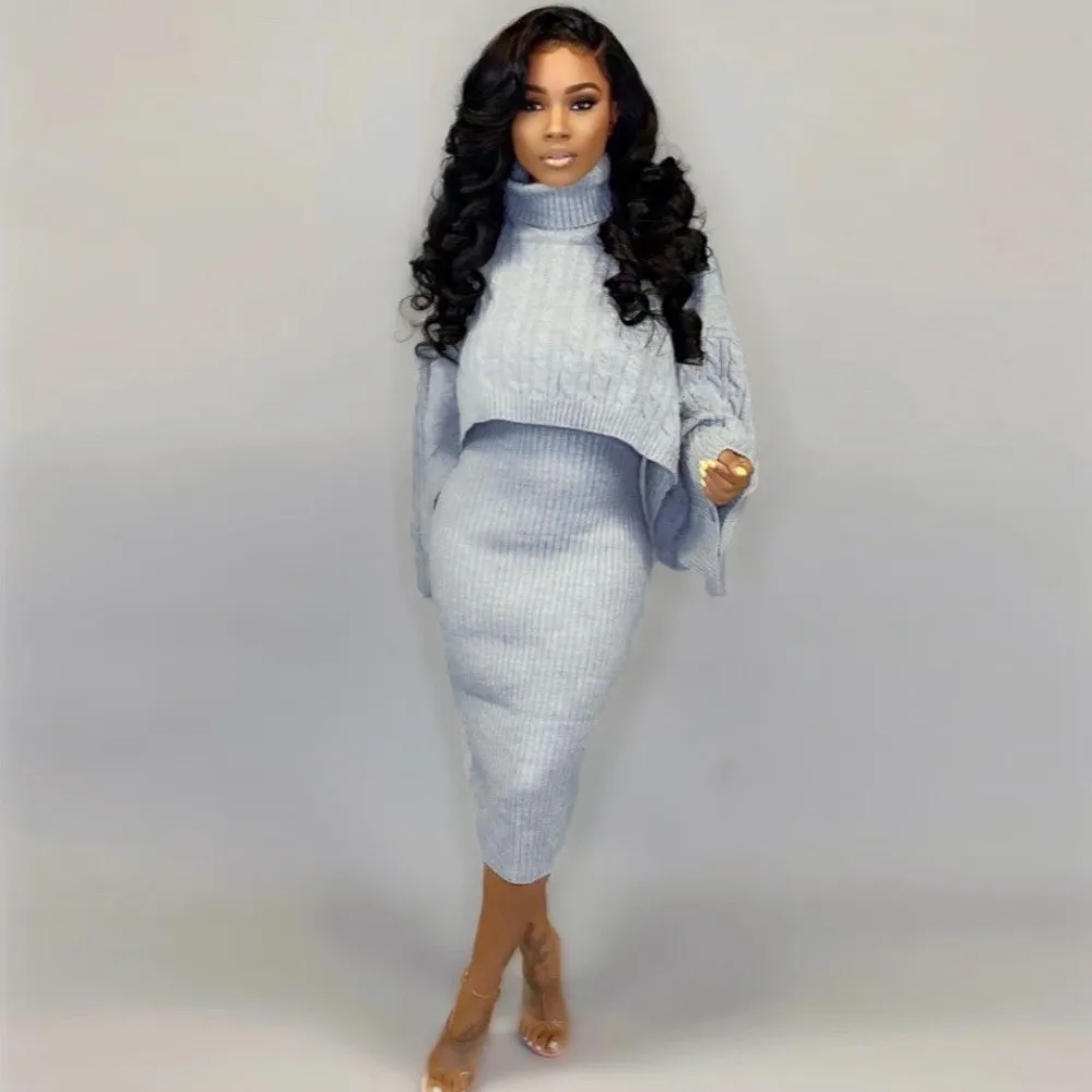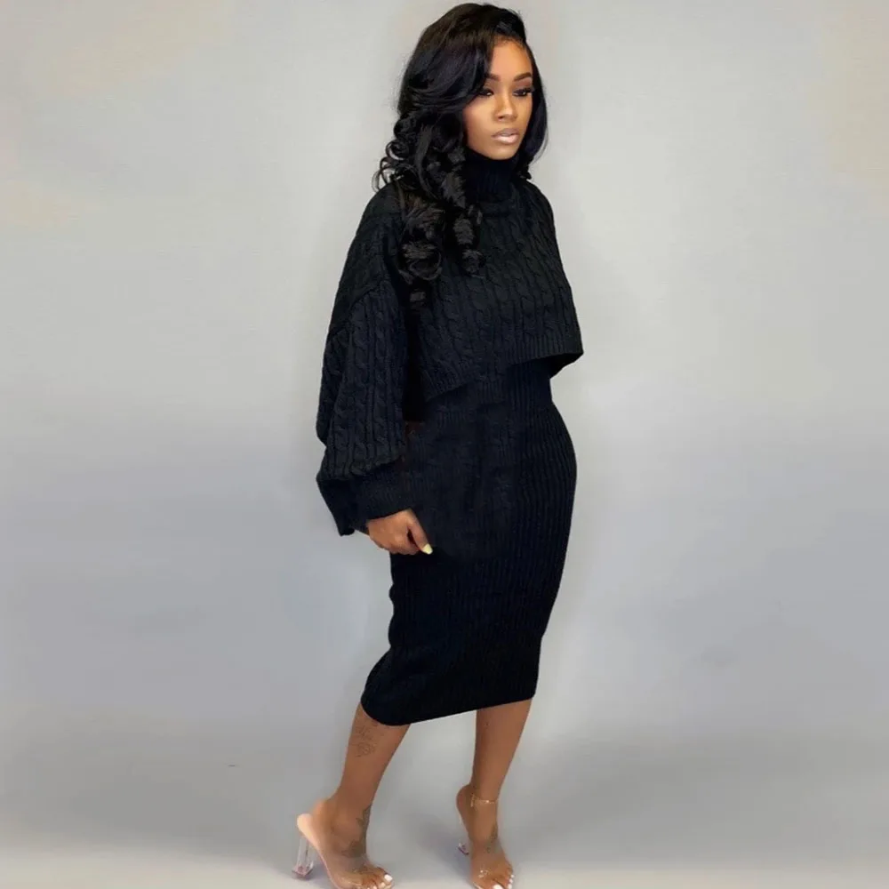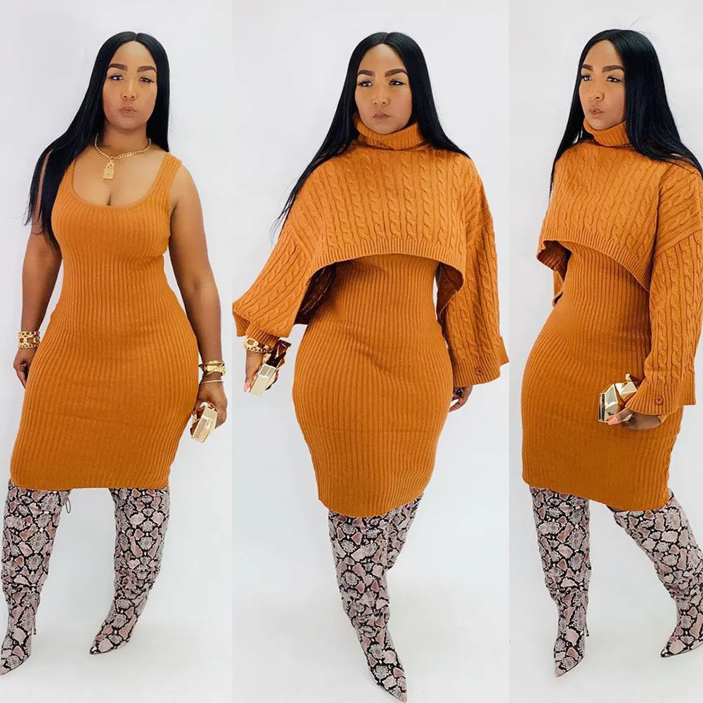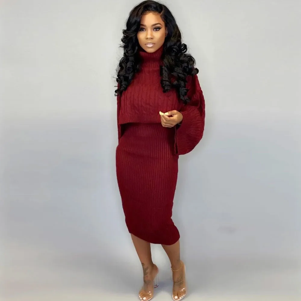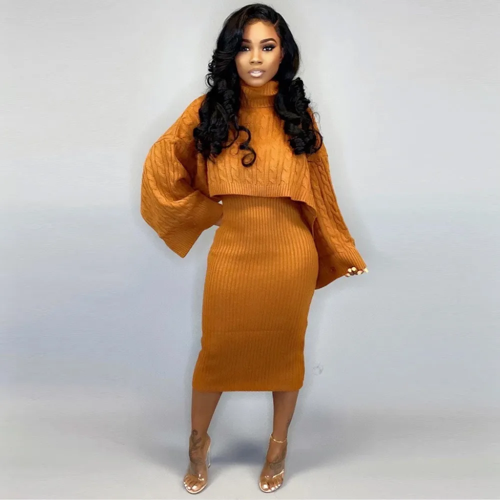 Turtleneck Long Sleeve Sweater Dress Women Autumn Winter Dress Loose Tunic Top Knit Rib Warm Two Piece Dresses Party Midi Dress