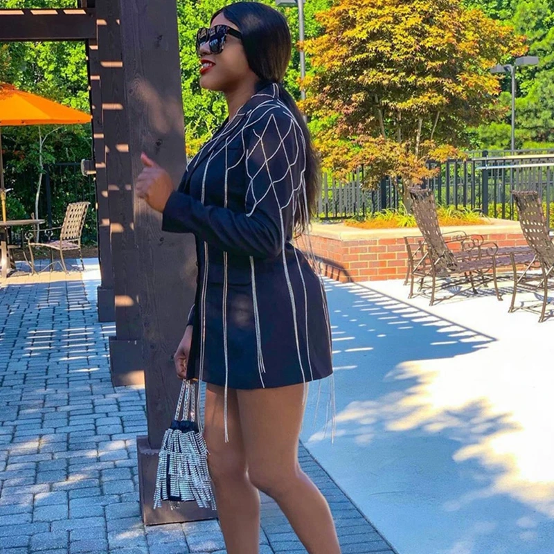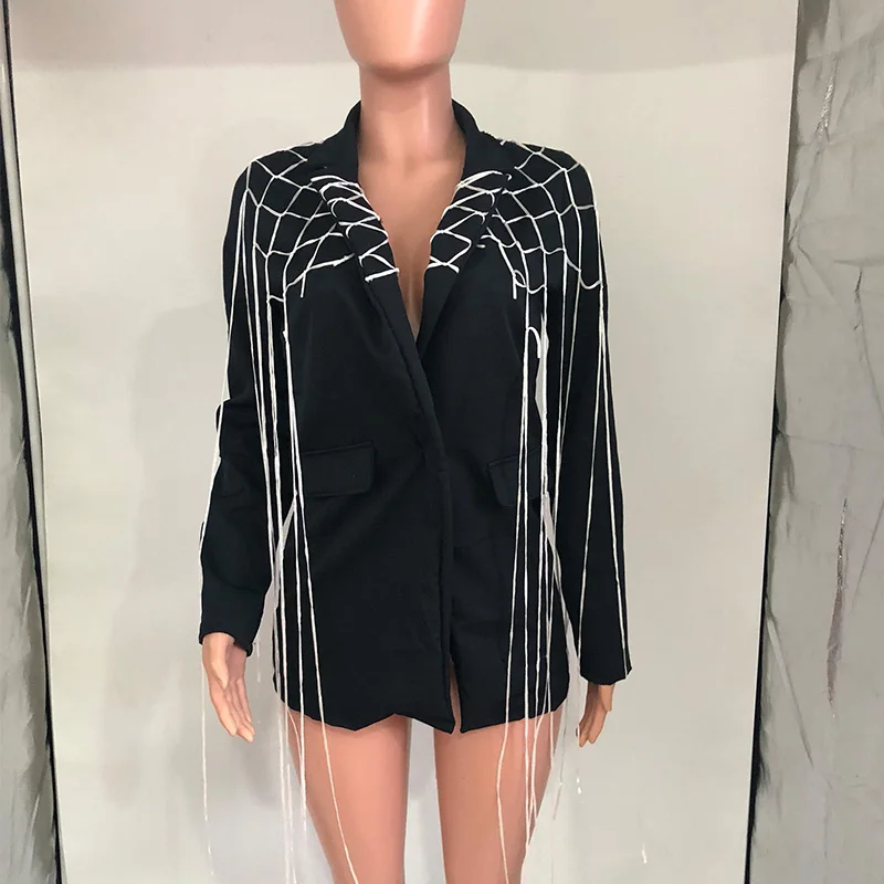 Black Blazer Dress Tassel Fringe Button Elegant Ladies Office Dress Long Sleeve Mini Party Dress