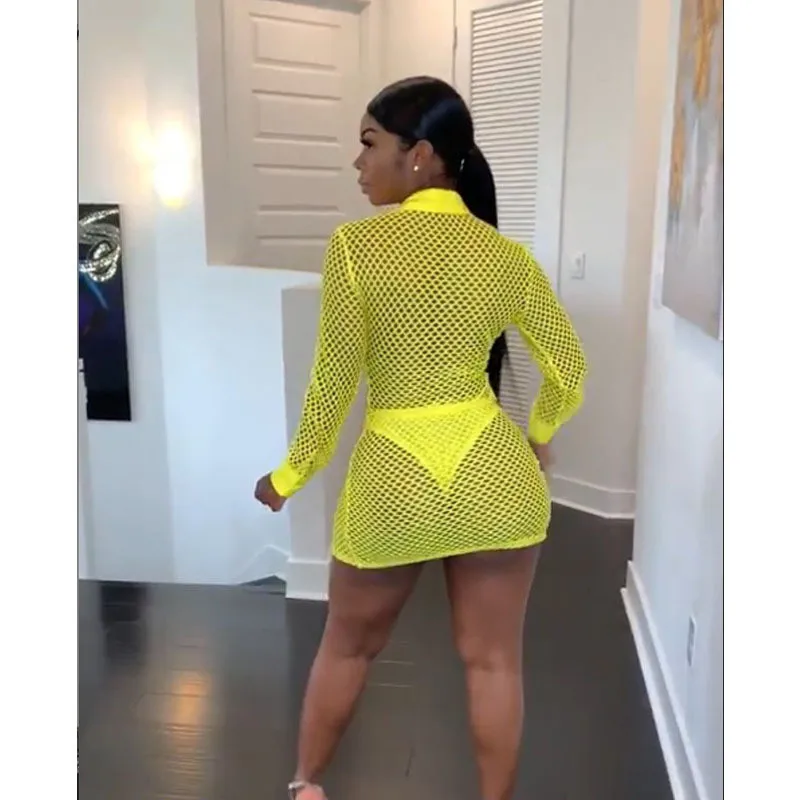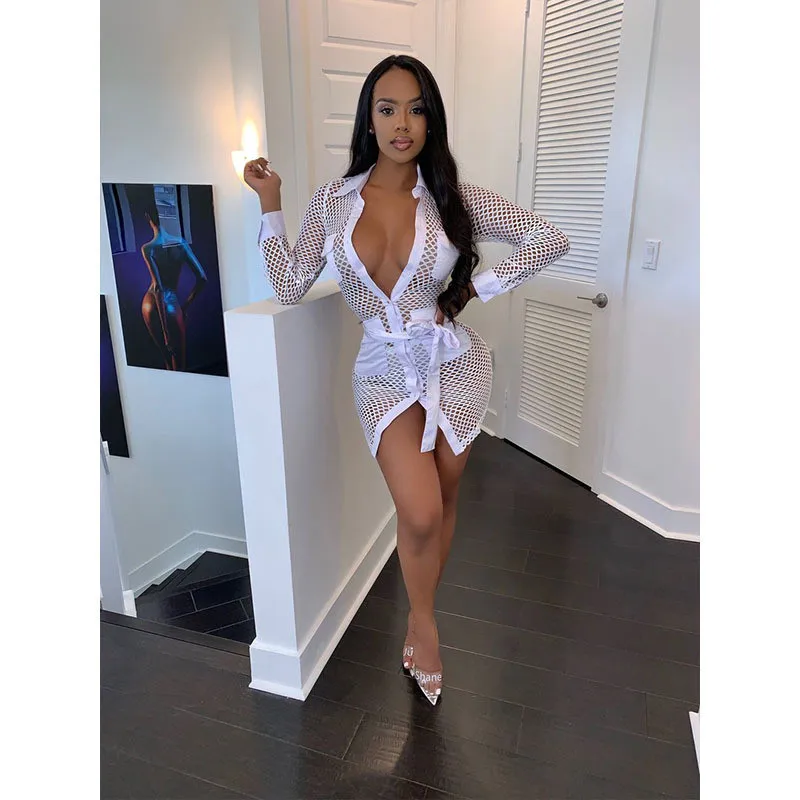 Autumn Long Sleeve Shirt Dress Women Turn-down Collar Button Up Pockets See Through Hollow Out Sexy Mini Party Dresses Vestidos