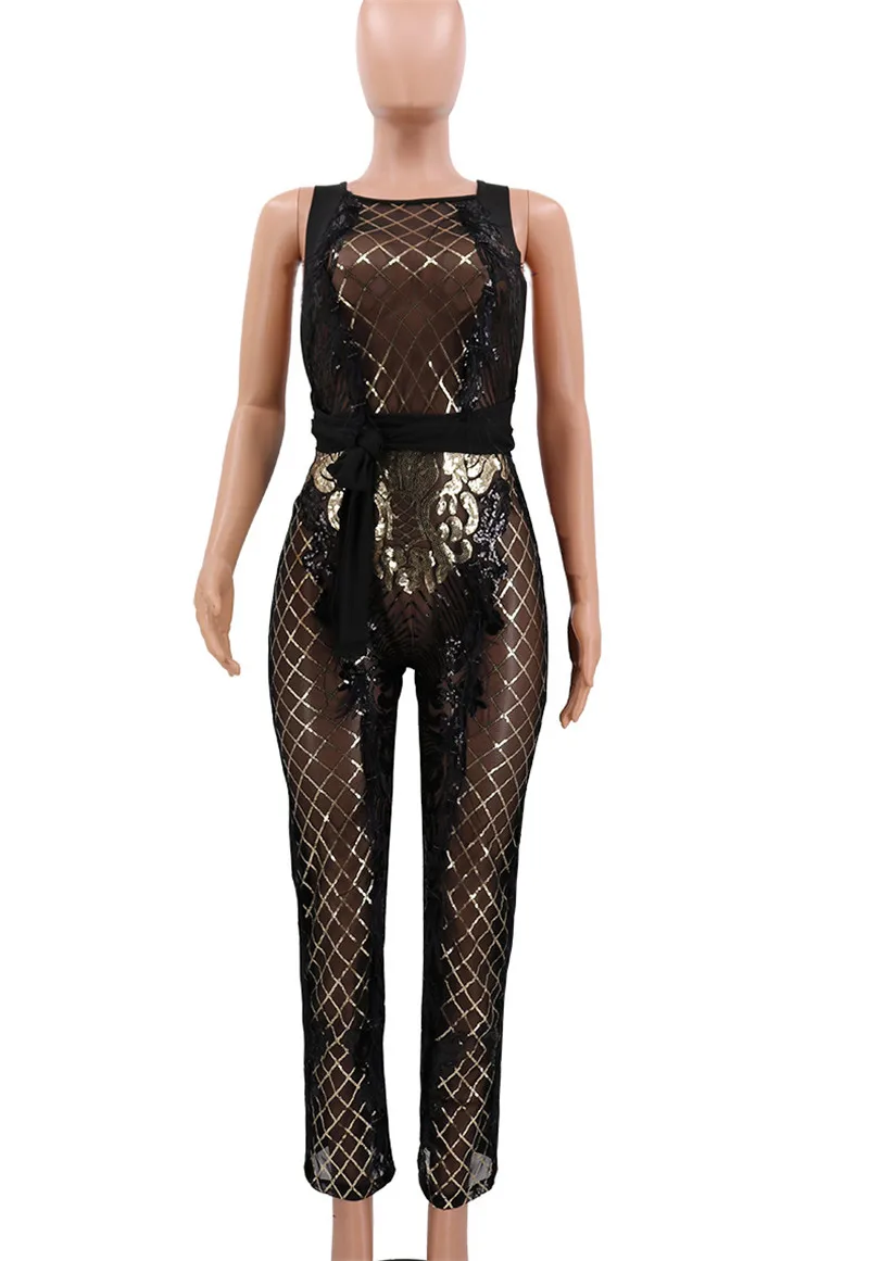 Backless Criss Cross Bandage Jumpsuit Women Mesh Sheer Sleeveless Geometric Sequin Romper Christmas Nightclub Sparkly Overalls